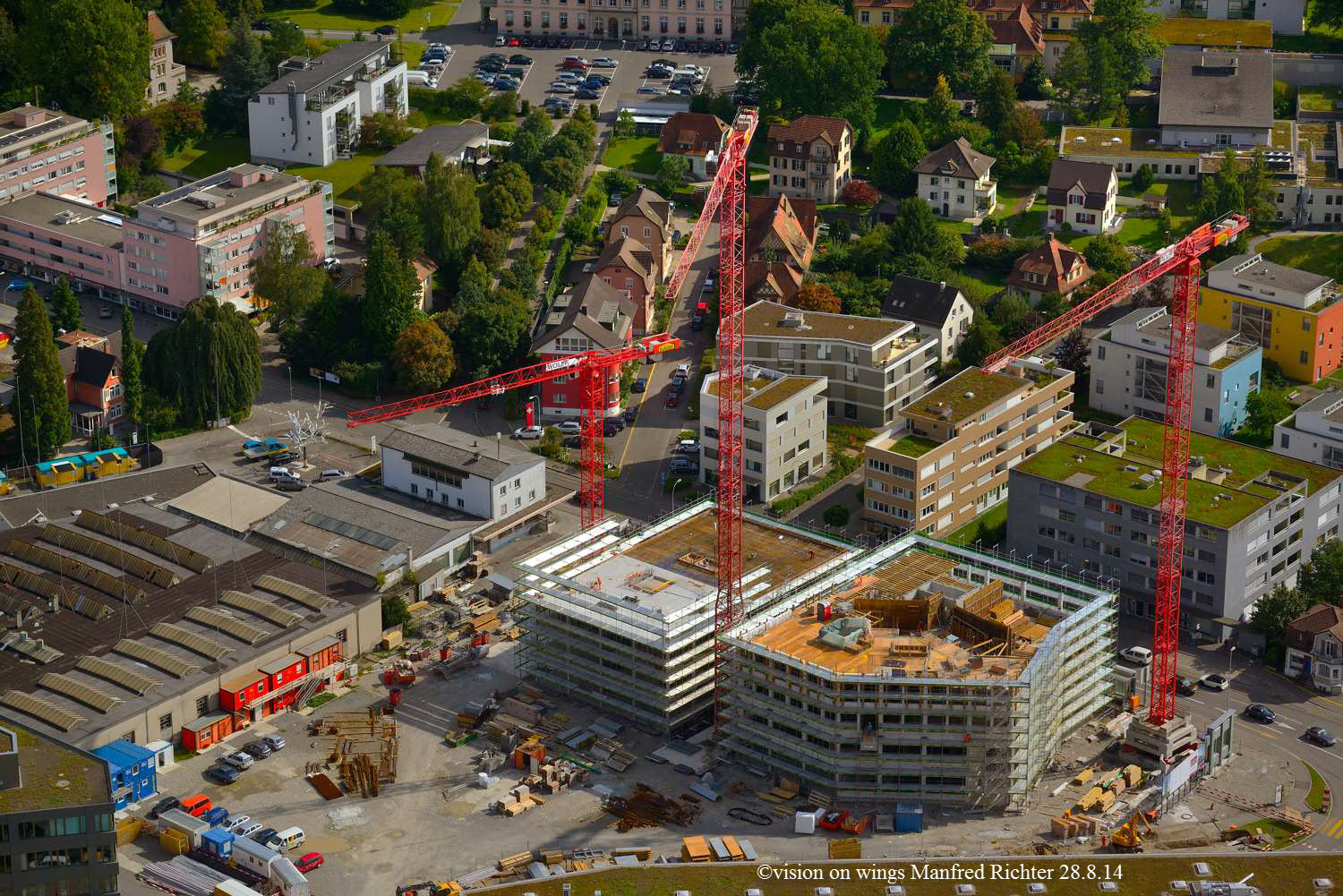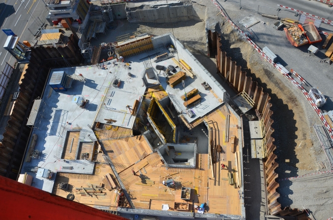 Die neue Eingangspforte zum Areal bildet das Hochhaus und Bürogebäude der GastroSocial am Gaisplatz. Ende November 2013 wurde der Grundstein gelegt und im 2-Wochen-Rhythmus wuchs das Bauwerk Stock für Stock in die Höhe. Und nun, knapp zwei Jahre später, steht es kurz vor seiner Fertigstellung.