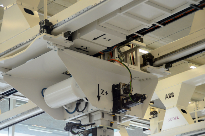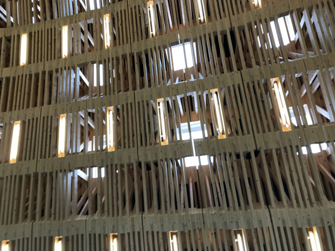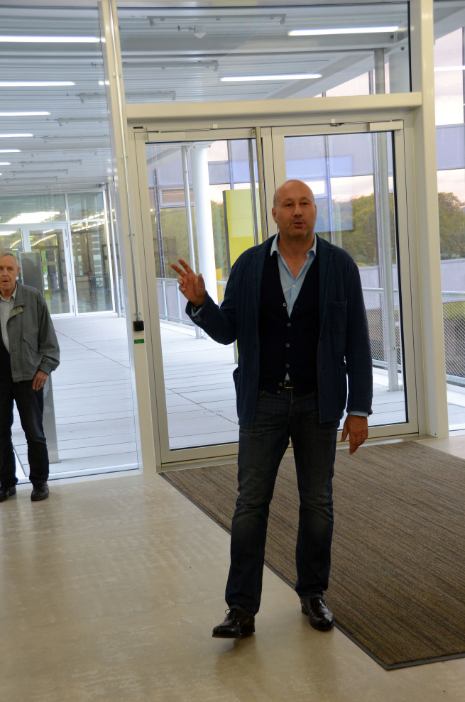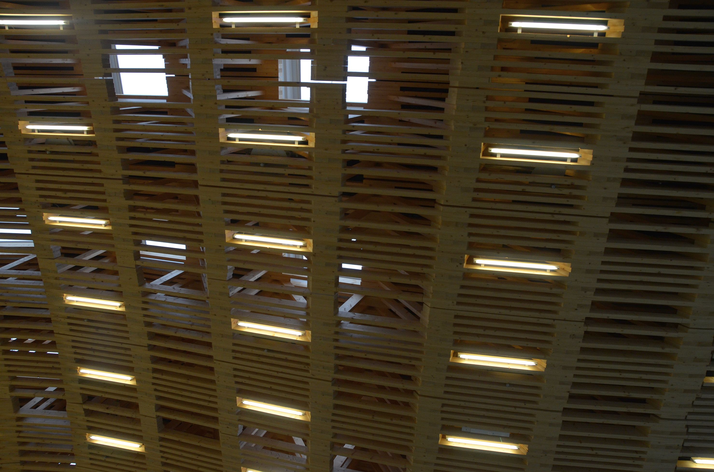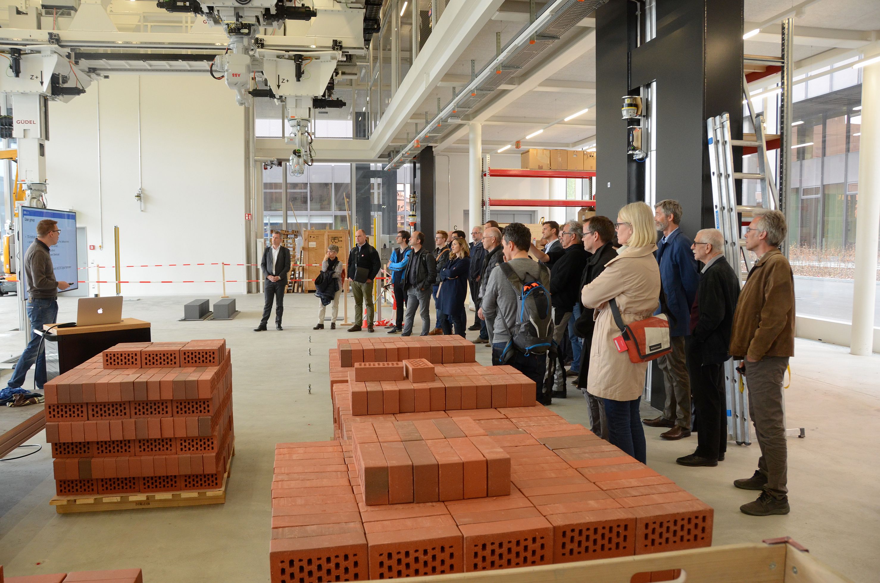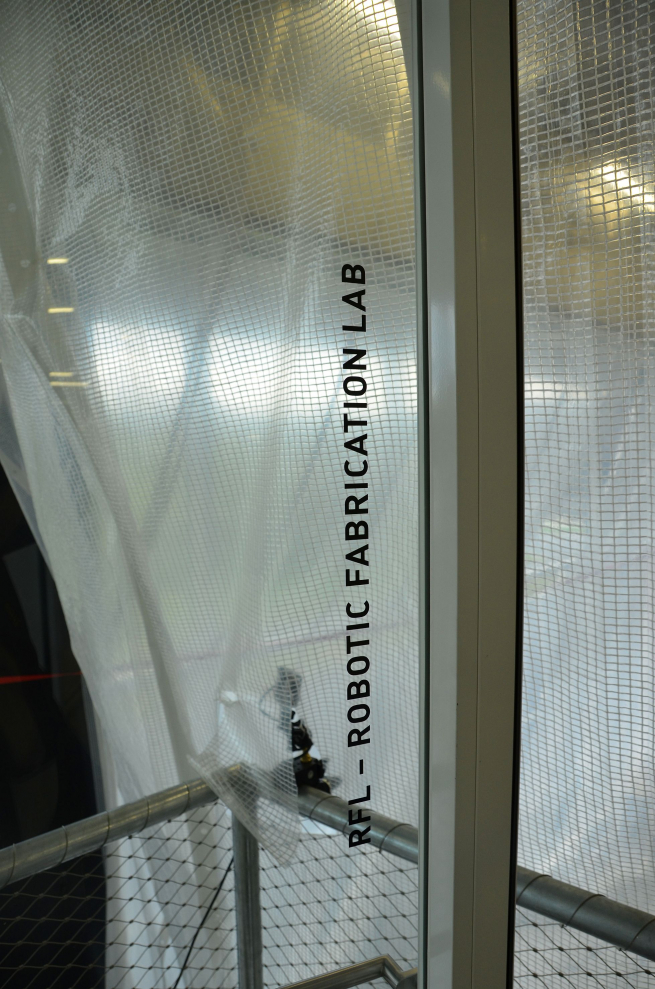 Nachdem wir vom alten „Schoggibunker“ über die Passerelle zum Neubau gelangten, führte uns Michael Lyrenmann, Laborleiter, anhand einer Präsentation ins neue Robotic Fabrication Lab ein. Hier ermöglicht ein deckenmontiertes Portalsystem die großmaßstäbliche Ausführung von Bauaufgaben mittels vier kooperierenden Industrierobotern. Die Roboter und Einrichtungen werden für interdisziplinäre Experimente im Bauwesen auf unterschiedlichste und eindrückliche Art und Weise eingesetzt. Zum Ende der Präsentation gab es einen fliegenden Wechsel an Prof. Sacha Menz, Architekt, Partner bei sam Architekten, geistiger Vater des Arch_Tec_Labs und ehemaliger Vorsteher des Instituts für Technologie in der Architektur. Zusammen schritten wir die Treppe zum darüberlegenden Geschoß mit den Räumen für die Professuren hinauf. Im folgenden Vortrag von Sacha Menz wurden die Gedanken und Hintergründe des fertigen Bauwerks erläutert. Besonders Eindrücklich war das robotergefertigte, geschwungene Holzdach, es entstand aus zehntausenden einzelnen Kanthölzern! Ohne weitere Verkleidung lässt die fein gegliederte Struktur das Dach als eine Gesamtform erscheinen, die mit elegantem Schwung und wechselndem Lichteinfall die offenen oberen Geschosse überwölbt.