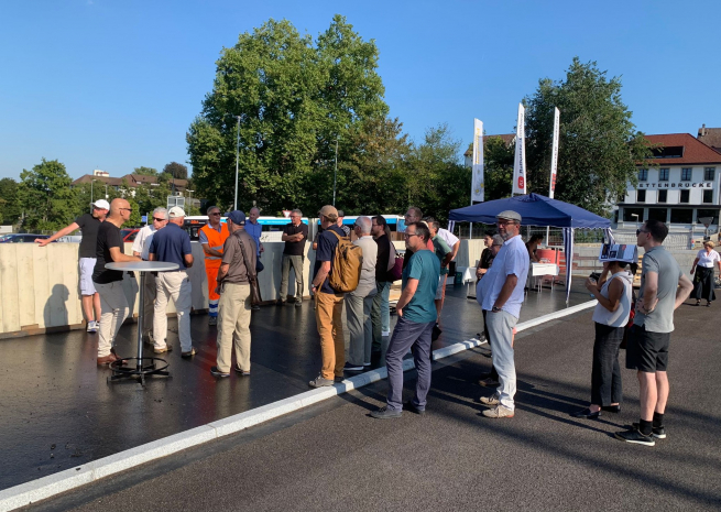 Über 100 sia aargau Mitglieder und ihre Begleitpersonen nahmen am Spaziergang auf der neuen Kettenbrücke «Pont Neuf» kurz vor der Übergabe an den Verkehr teil. Dies war die letzte Gelegenheit, dieses Kunstwerk ohne Autoverkehr zu begehen und ohne nasse Füsse zu bestaunen. Der Gesamtprojektleiter Roberto Scappaticci (ATB, Unterabteilung Realisierung, Kanton Aargau) und weitere Vertreter der Bauherrschaft haben die Teilnehmenden gruppenweise über die bautechnischen Herausforderungen, die Überraschungen und Schwierigkeiten der Bauphase informiert. Dieser grosse und spannende Anlass wurde durch ein Stehapéro perfekt abgerundet!