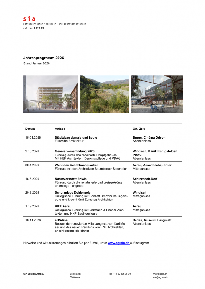 15.1.26-18.11.26 | Brugg, Windisch, Aarau, Schinznach-Dorf, Baden Jahresprogramm 2026 Bitte aktivieren Sie Javascript um diese Seite optimal nutzen zu können. Bilder Zur Übersicht der VeranstaltungenZur Übersicht der bevorstehenden Veranstaltungen «Jahresprogramm»