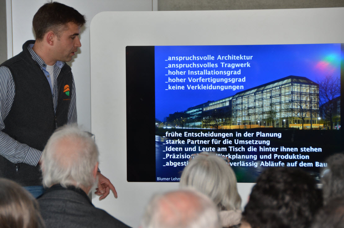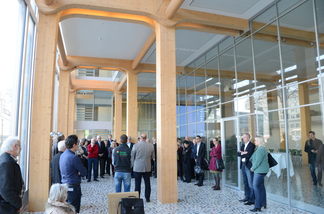 Als Einstimmung auf die Generalversammlung stand die Besichtigung des 2013 eröffneten Bürogebäudes der Mediengruppe Tamedia auf dem Programm. Das einzigartige Gebäude aus Holz und Glas des japanischen Architekten Shigeru Ban wurde uns durch den verantwortlichen Holzbauingenieur Martin Antemann der ausführenden Holzbau¬firma Blumer Lehmann erläutert. Bemerkenswert die Erkenntnis, welche Präzision dem Holzbau eigen ist und mit welchen konstruktiven und logistischen Herausforderungen dieses innovative Holzbautragwerk realisiert werden konnte.
