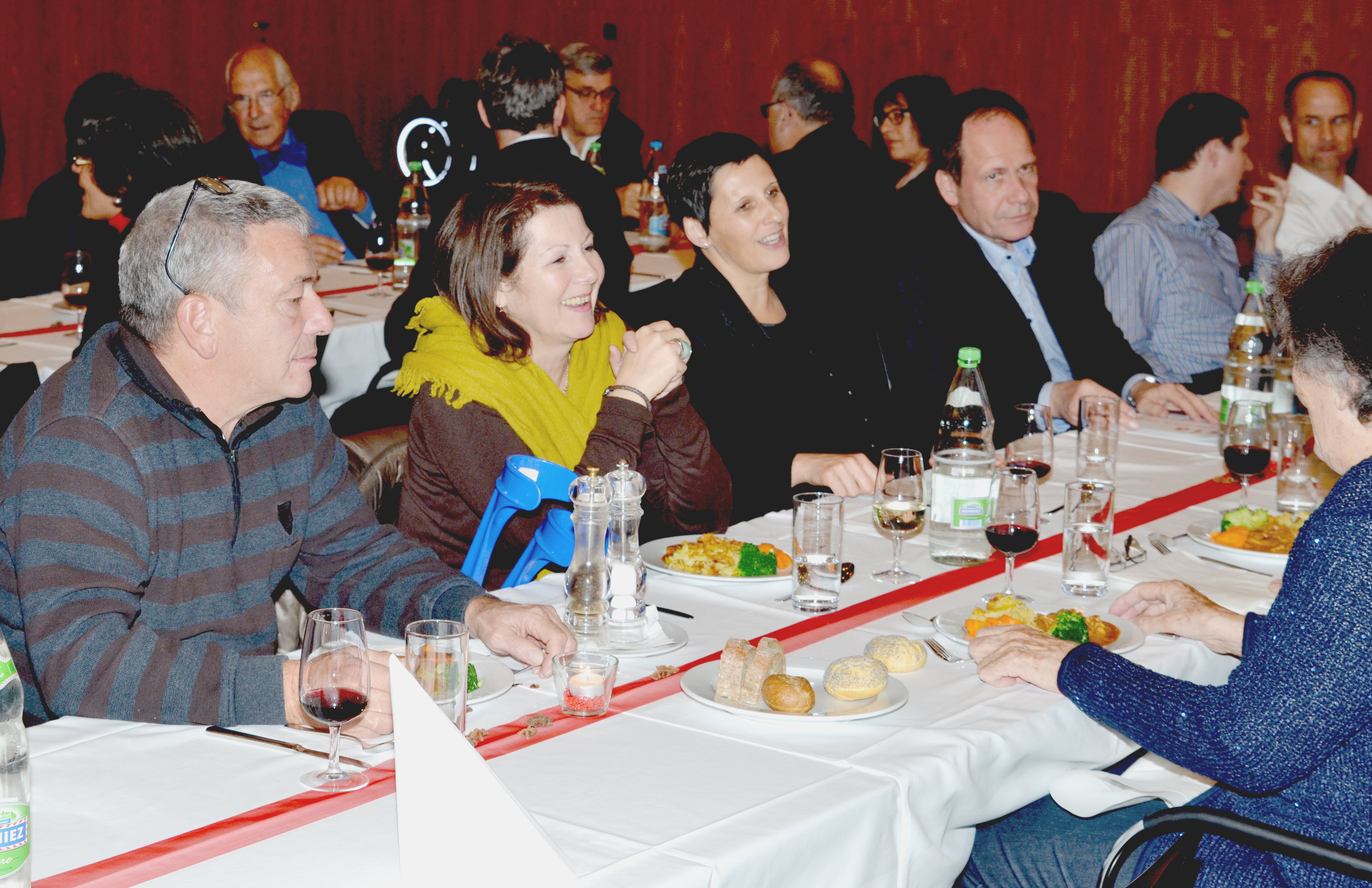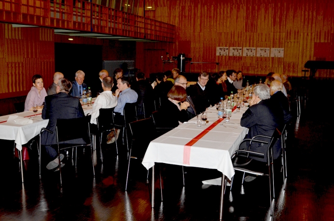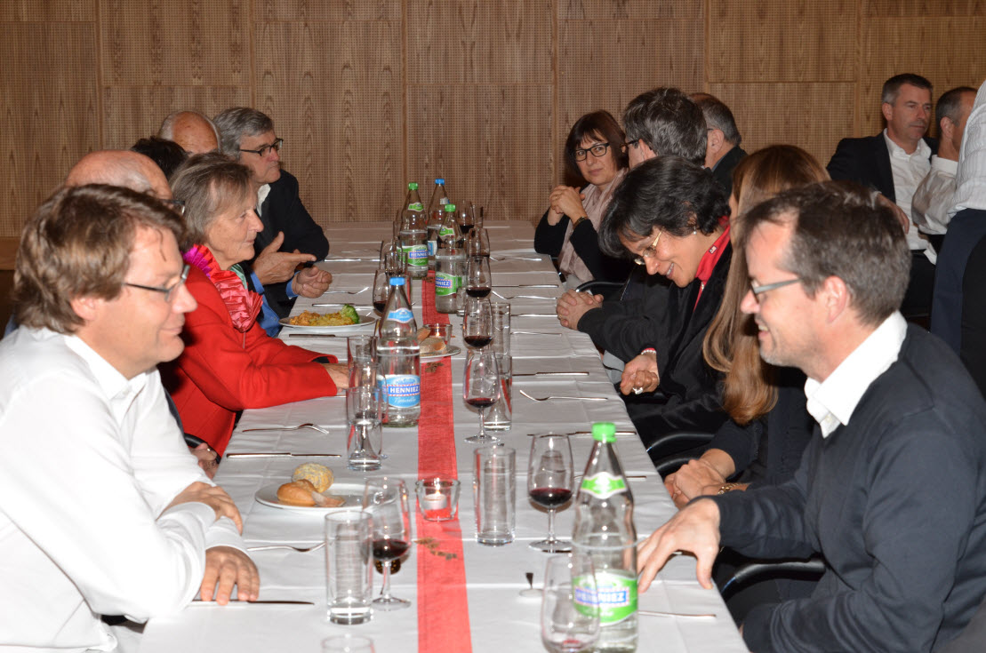 Im Anschluss an die Verleihung des Preises bot sich die Gelegenheit, das preisgekrönte Gebäude am Martinsberg unter fachkundiger Führung von Daniel Krieg zu bestaunen. Durch die Umnutzung des bestehenden Wohlfahrtsgebäudes zu einem Schulgebäude konnten die beeindruckenden Räume in ihren Funktionen weitest gehend erhalten werden. In einem davon, der Aula, liess man den Abend bei einem gemütlichen Abendessen und angeregten Diskussionen ausklingen.